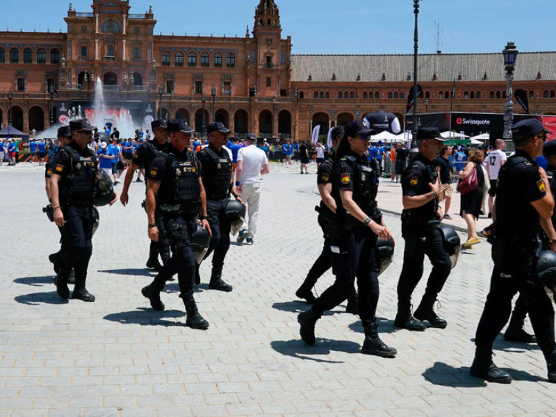 Efectivos de la Policía Nacional velan por la seguridad de la Plaza de España, en Sevilla ante la presencia de numerosos aficionados del Eintracht y del Rangers. CORDONPRESS
