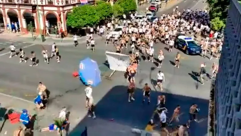 Imagen de la batalla campal en Sevilla entre hinchas del Eintracht y del Rangers