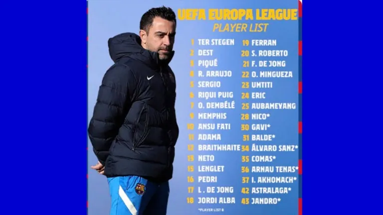 Esta es la lista completa del Barça para disputar la Liga Europa: Ter Stegen, Sergiño Dest, Gerard Piqué, Ronald Araujo, Sergio, Riqui Puig, O. Dembélé, Memphis, Ansu Fati, Adama, Braithwaite, Neto, Lenglet, Pedri, L. De Jong, Jordi Alba, Ferran, S. Roberto, F. De Jong, O. Mingueza, Umtiti, Eric, Aubameyang, Nico, Gavi, Balde, Álvaro Sanz, Comas, Arnau Tenas, I. Akhomach, Astralaga y Jandro.