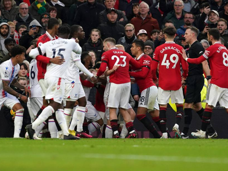 Tempers flare between players, resulting in a red card for Manchester United's Casemiro during the Premier League match at Old Trafford, Manchester. Picture date: Saturday February 4, 2023.