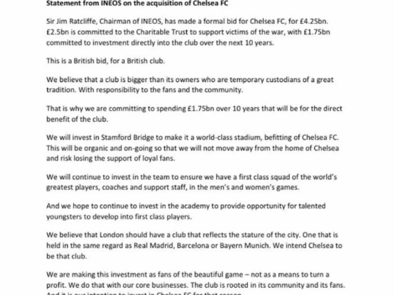 La propia compañía ha confirmado en un comunicado que la operación superaría los 5.000 millones de euros siendo la más importante de la historia de una franquicia deportiva. La propuesta del multimillonario británico ha descolocado a los otros tres interesados en hacerse con el Chelsea, equipo hasta ahora dirigido por Roman Abramovich: Todd Boehly (dueño de los LA Dodgers), sir Martin Broufhton (antiguo presidente del Liverpool) y Stephen Pagliuca (propietario del Atalanta y los Bston Celtics). Estos empresarios eran los candidatos definitivos designados por el Raine Group, el banco neoyorquino que ha gestionado el proceso de venta junto a los dirigentes del Chelsea en las últimas semanas y que no había incluido la oferta de Ineos.
