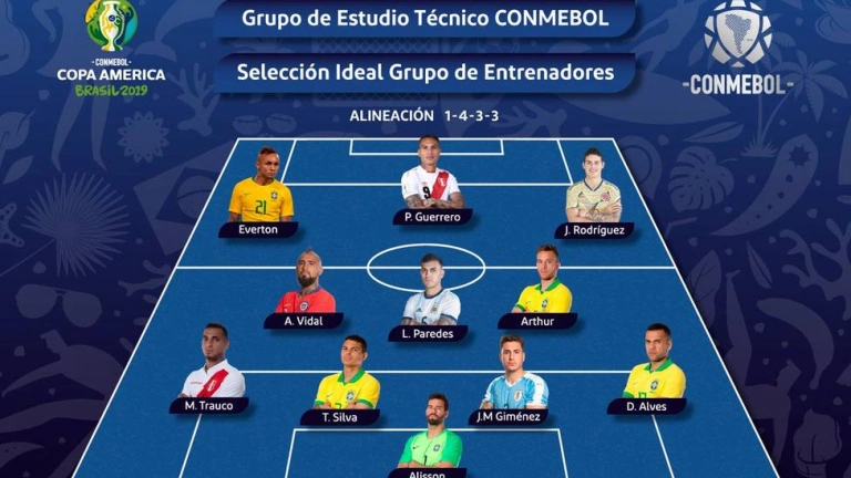 Cinco jugadores brasileños, dos peruanos, un argentino, un uruguayo, un colombiano y un chileno integran el "equipo ideal" de la Copa América Brasil 2019 elegido por los entrenadores que integran el llamado Grupo de Estudio Técnico (GET) de la Confederación Sudamericana de Fútbol (Conmebol) y divulgado este martes.
