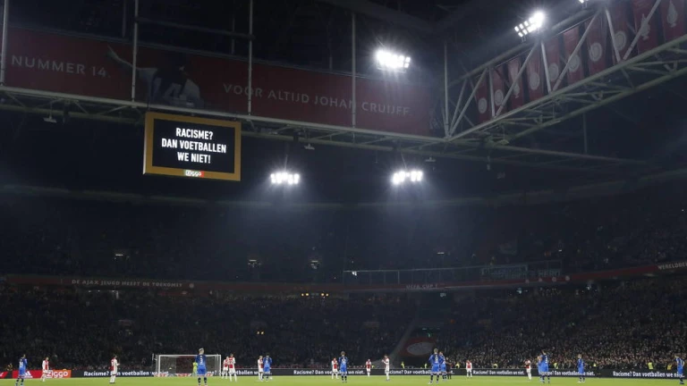 En el Johan Cruyff Arena de Amsterdam, el centrocampista del Ajax Donny van de Beek paró la pelota tras el saque desde el centro de campo, momento en el que apareció en los marcadores electrónicos del estadio la frase “¿Racismo? Entonces no jugamos”.