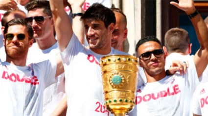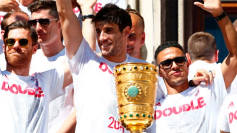 Pep Guardiola se convirtió en la imagen de la celebración del doblete del Bayern de Munich ante la afición. La plantilla se asomó al balcón de Marienplatz, donde hubo un momento de protagonismo para los futbolistas españoles: Javi Martínez, Xabi Alonso, Tiago y Bernat se abrazaron cuando sonó, desde la megafonía, una versión de la canción 'Que viva España'. Guardiola pasó el trago del momento en un segundo plano.