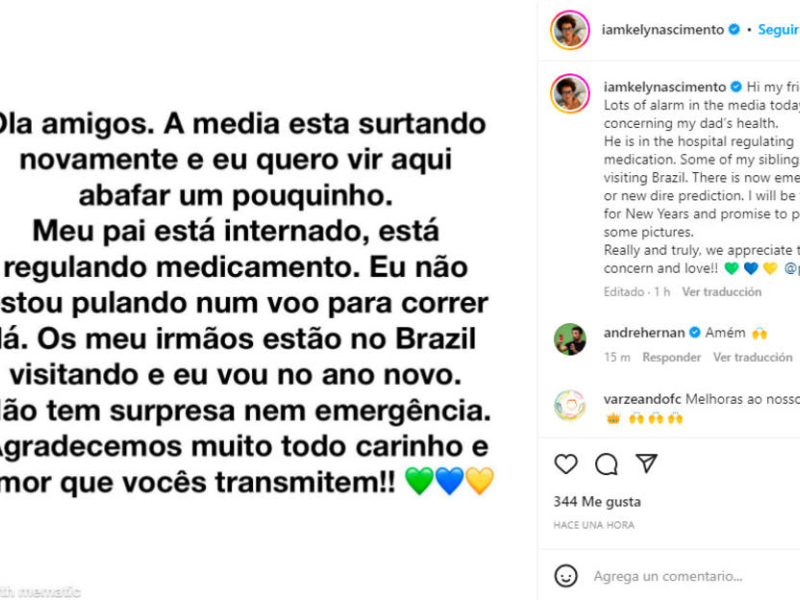 Pese a que ni la asesoría del por muchos considerado mejor futbolista de todos los tiempos ni el hospital dieron informaciones, su hija Kely Nascimento publicó un mensaje en su cuenta en Instagram para tranquilizar a los aficionados y en el que aclaró que no se trata de nada grave.
