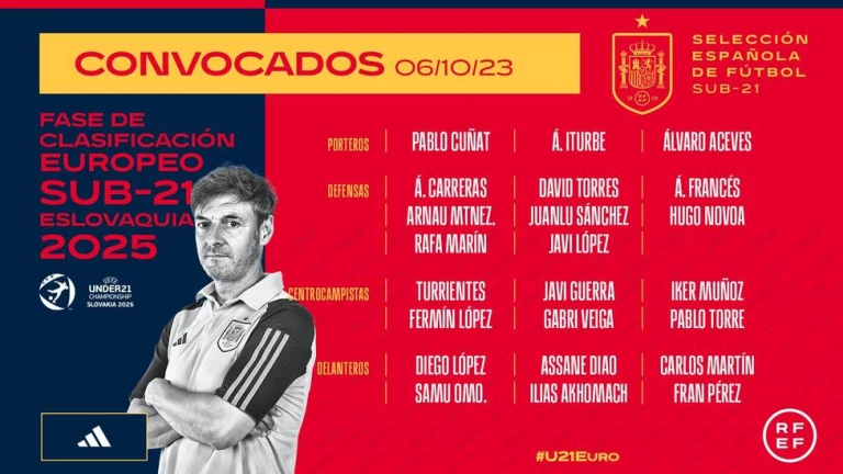 Una convocatoria de España sub-21 que cuenta con siete novedades respecto a la de septiembre, ninguna de ellas en portería. Se caen los defensas Hugo Bueno, Álvaro Carrillo y Stefan Bajcetic -este por lesión; los centrocampistas Nico González y Pablo Barrios -lesión; y los delanteros Robert Navarro e Iván Azón.