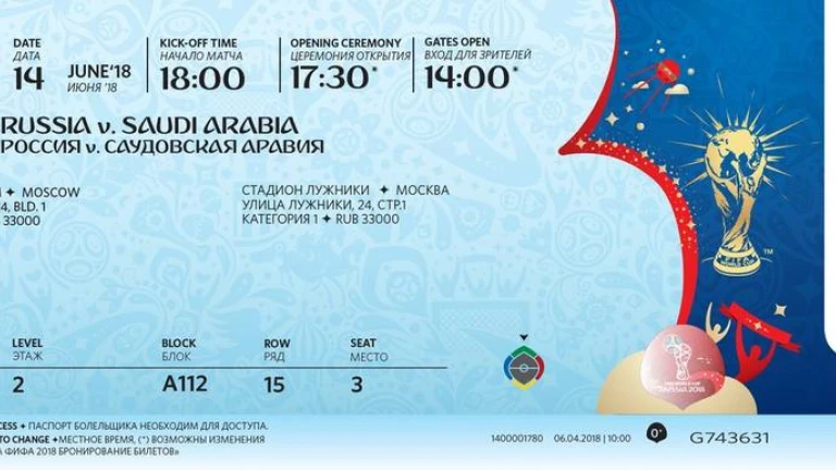 La entrada, que tiene un fondo azul con tradicionales motivos rusos, incluye en su parte superior el logotipo de la Copa Mundial Rusia 2018, la fecha del partido, la hora de la apertura de las puertas del estadio y del inicio del encuentro.
