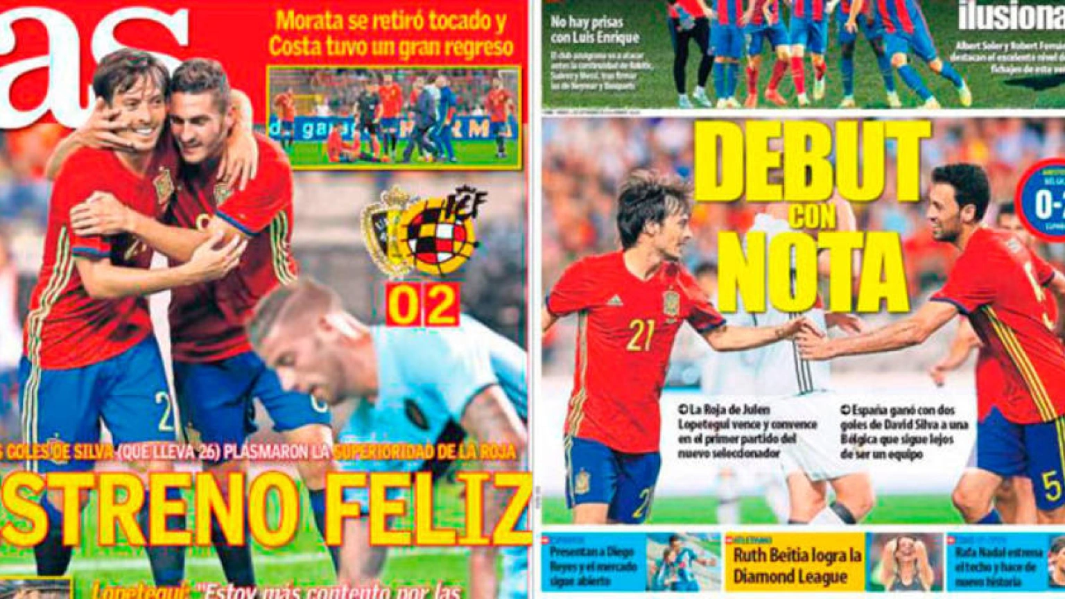 El triunfo de la selección española de fútbol por 0-2 en el amistoso contra Bélgica en Bruselas copa las portadas de los principales periódicos deportivos españoles. Marca, As, Mundo Deportivo y Sport destacan el buen juego del equipo en el debut de Lopetegui como seleccionador. El diario 'Marca' presenta su portada con una foto de la mayoría de los componentes de la selección celebrando uno de los dos goles del canario David Silva. "Un recital para empezar", titula Marca, que destaca en el subtítulo: "la España de Julen ilusiona con un Silva magistral". También destaca el "susto" de Morata "al retirarse con un golpe" y se hace eco de las declaraciones de Diego Costa: "Como no soy español natural la gente siempre busca criticarme". El 'Mundo Deportivo' de Barcelona también da el protagonismo en su portada a la victoria de la selección, con una foto de Busquets felicitando a Silva por uno de sus goles y con el titular "Debut con nota". En el subtítulo dice: "La Roja de Julen Lopetegui vence y convence en el primer partido del nuevo seleccionador", añadiendo que "España ganó con dos goles de David Silva a una Bélgica que sigue lejos de ser un equipo". El diario madrileño 'As' escoge para ilustrar su portada una foto de Silva y Koke celebrando uno de los goles, con el título "Estreno feliz". El subtítulo reza: "Dos goles de Silva (que lleva 26) plasmaron la superioridad de la Roja". También destaca que "Morata se retiró tocado y Costa tuvo un gran regreso", y lo acompaña con una foto de la lesión del delantero del Real Madrid. Por último, da espacio a una frase de Lopetegui tras el partido: "Estoy más contento por las sensaciones que por el resultado". El barcelonés 'Sport' dedica su portada a la posible renovación de Messi y relega el partido de la selección española a la esquina inferior izquierda, con una pequeña foto de Silva y Koke acompañada del título "Debut de la 'era Lopetegui' con buen sabor de boca".