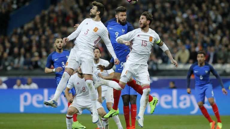 France's Olivier Giroud heads at goal as Spain's Sergio Ramos and Gerard Pique defend