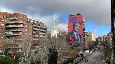 Este martes ha aparecido una lona promocionando la candidatura de Joan Laporta para las elecciones al Barcelona en una calle próxima al Estadio Santiago Bernabéu.