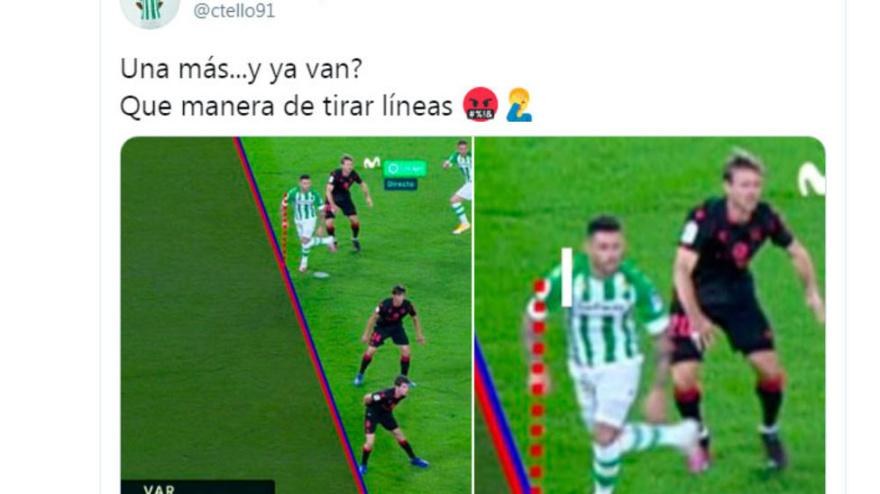 El jugador del Betis publicó un tweet quejándose por cómo tiró la línea del fuera de juego el VAR en el gol anulado a Sanabria.
