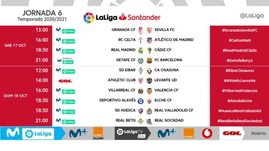 LaLiga ha dado a conocer los horarios de la 6ª jornada de LaLiga Santander que se disputará el sábado 17 de octubre y domingo 18.