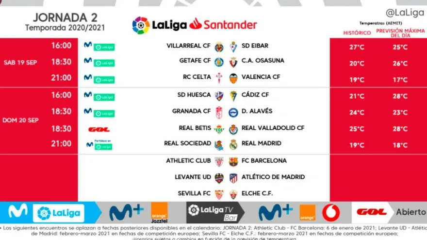 LaLiga cambia los horarios de la 2ª jornada y no se jugará ni viernes ni lunes