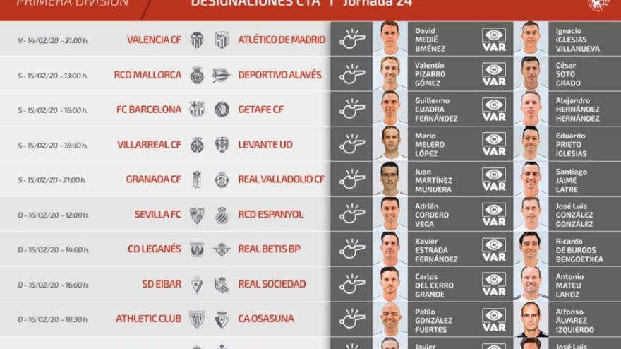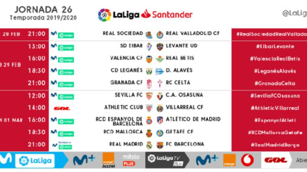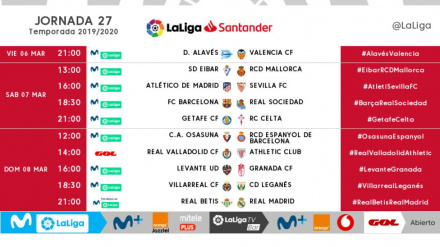 La jornada se disputará entre el viernes 6 y el domingo 8 de marzo. El Atlético de Madrid - Sevilla se jugará el sábado 7 a las 16:00 horas en el Wanda.