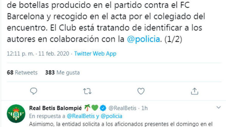 Sánchez Martínez recogió en el acta del partido del Betis-Barcelona que, tras la expulsión de Fekir, se arrojaron varias botellas de plástico.