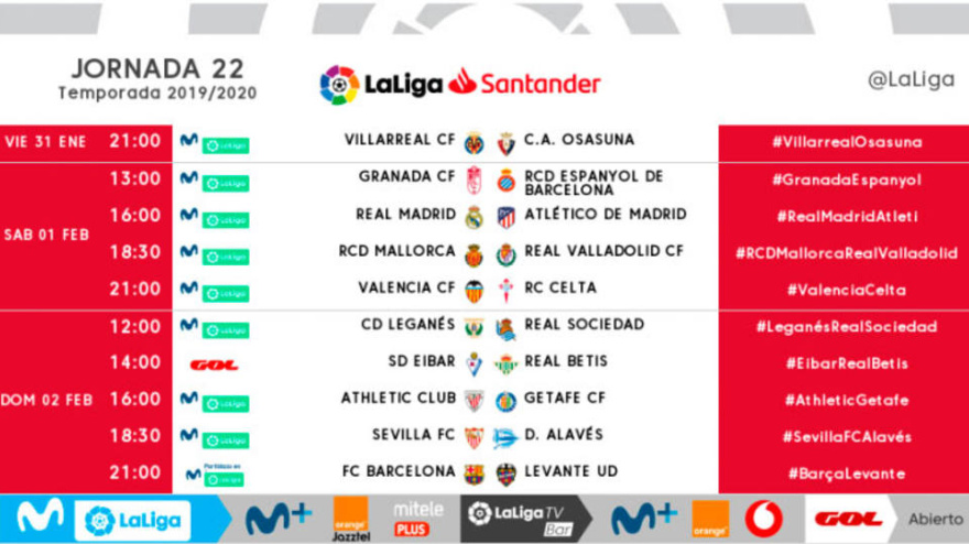 La jornada se abrirá el 7 de febrero con el Valladolid - Villarreal (21:00) y se cerrará a la misma hora del domingo 9 con el Betis - Barcelona.