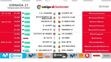 La 21ª jornada arrancará el viernes 24 con el Osasuna-Levante. El Valencia-Barça, partido estrella, será el sábado 25 de enero a las 16:00 horas.
