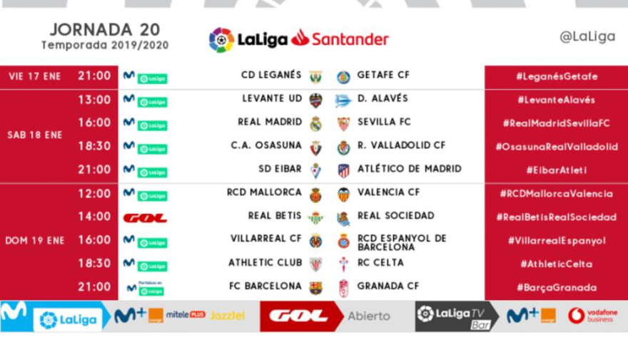 El partido estrella de la jornada, el Real Madrid - Sevilla, se jugará el sábado 18 de enero a las 16:00 en el Santiago Bernabéu.