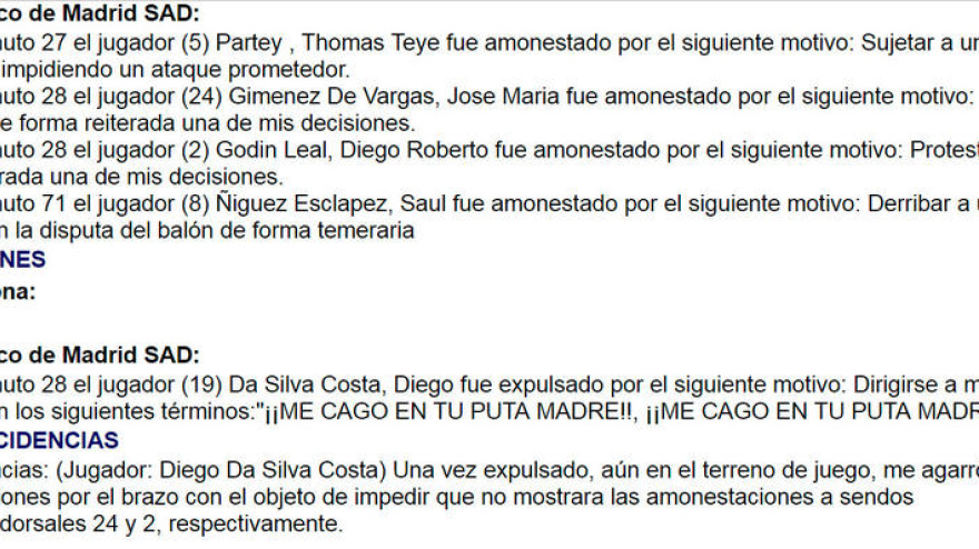 El acta del partido recoge que Diego Costa fue expulsado tras dirigirse a Gil Manzano en dos ocasiones diciéndole: "Me cago en tu p... madre".