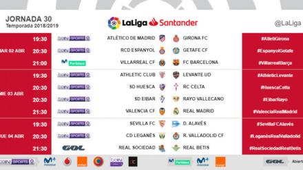La jornada trigésima, intersemanal, tendrá tres partidos el martes 2 de abril, cuatro el miércoles 3 de abril y otros tres el jueves 4.