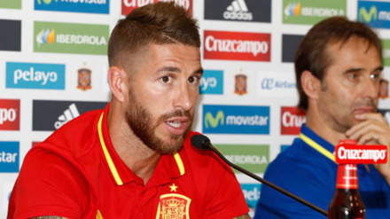 Sergio Ramos y Sergio Busquets comparecieron ante los medios de comunicación acompañados de Lopetegui en la primera concentración con el nuevo seleccionador.