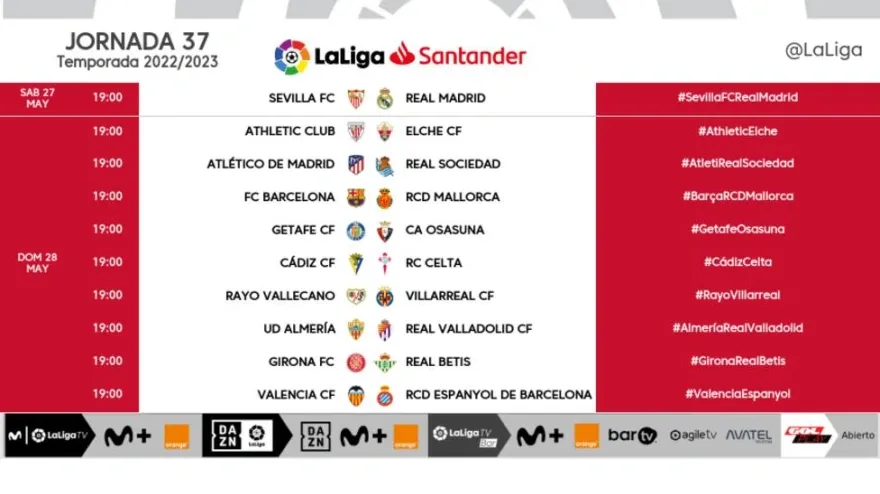 El partido de la 37ª jornada, que debía jugarse en horario unificado el domingo 28 de mayo a las 19:00 horas se adelanta un día para dar más descanso al Sevilla de cara a la final.