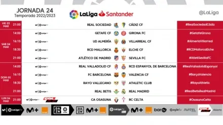 La jornada arrancará el viernes 3 de marzo con el Real Sociedad-Cádiz y finalizará el lunes 6 con el Osasuna-Celta. El Betis-Real Madrid se jugará el domingo a las 21:00 horas.