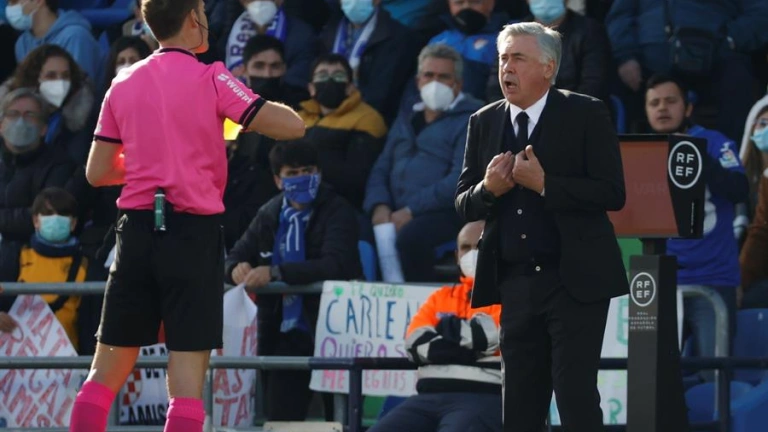 Ancelotti no reclamó una acción que el Real Madrid pidió penalti sobre Marcelo por un agarrón y no reprochó nada al colegiado, salvo su criterio en las cartulinas amarillas: "El árbitro no ha sido determinante. Me enfadé porque terminamos la primera parte con dos amarillas, una para mí que juro no he hecho falta y la otra par Rodrygo cuando creo que se pudieron sacar más amarillas".