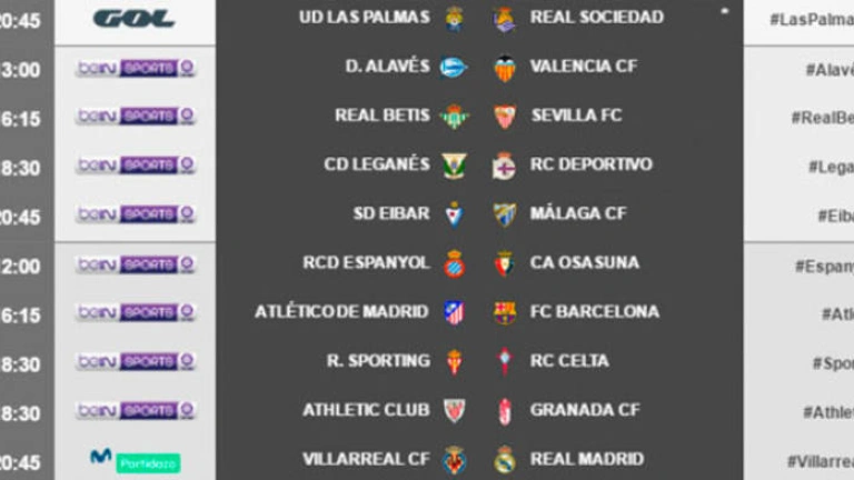 HORARIOS JORNADA 24 Viernes, 24 de febrero20.45h. UD Las Palmas - Real SociedadSábado 25 de febrero13.00h. Alavés - Valencia 16.15h. Betis - Sevilla 18.30h. Leganés - Deportivo 20.45h. Eibar - MálagaDomingo 25 de febrero12.00h. Espanyol - Osasuna 16.15h. At. Madrid - Barcelona 18.30h. Athletic Club - Granada 18.30h. Sporting - Celta 20.45h. Villarreal - Real Madrid