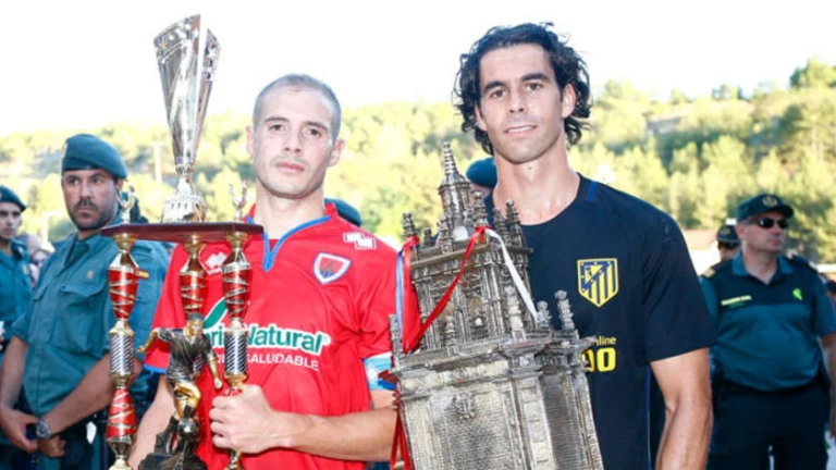 Tiago posa con el trofeo de campeón acompañado del capitán del Numancia (FOTO - @Atleti)
