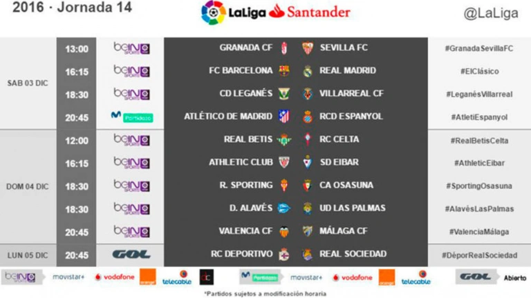 La Liga ha hecho oficial los horarios de la 14ª jornada de la LigaSantander, en el que destaca el Clásico que se jugará en el Camp Nou.