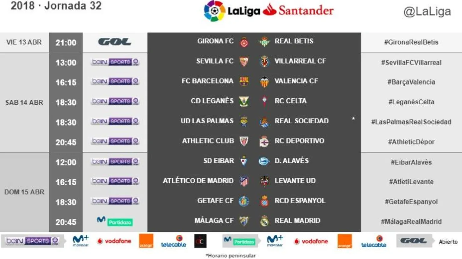 El partido Barcelona-Valencia se jugará el sábado 14 de abril a las 16.15 horas dentro de la jornada 32 de La Liga Santander, que empezará con el Girona-Betis, el viernes 13 a las 21.00 horas, y acabará con el Málaga-Real Madrid, el domingo 15 a las 20.45, según confirmó LaLiga este lunes.