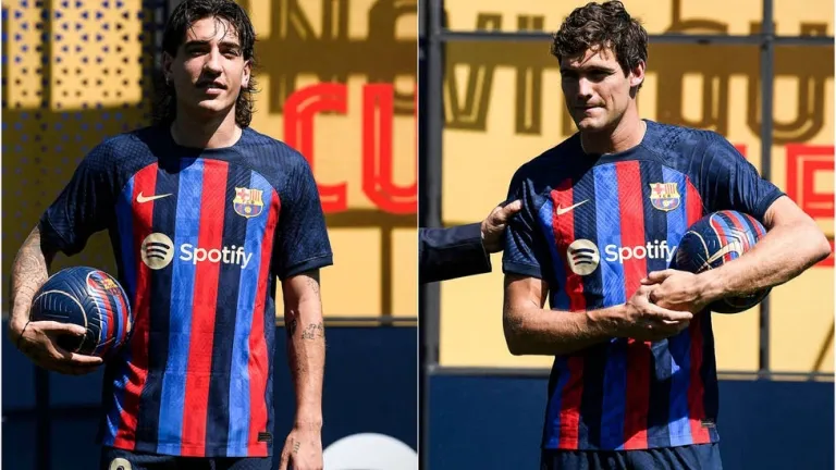 Héctor Bellerín y Marcos Alonso han sido presentados como nuevos jugadores del FC Barcelona, en un acto conjunto en la Ciudad Deportiva de Sant Joan Despí. Los nuevos laterales del cuadro blaugrana, ambos procedentes de la Premier League, han sido acompañados por Joan Laporta, mientras lucían su nueva camiseta.