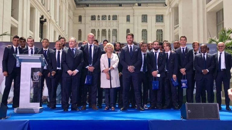 El acto institucional en el Ayuntamiento terminó con una foto de familia en la que posó la alcaldesa, los jugadores de la plantilla del Real Madrid y el presidente Florentino Pérez.