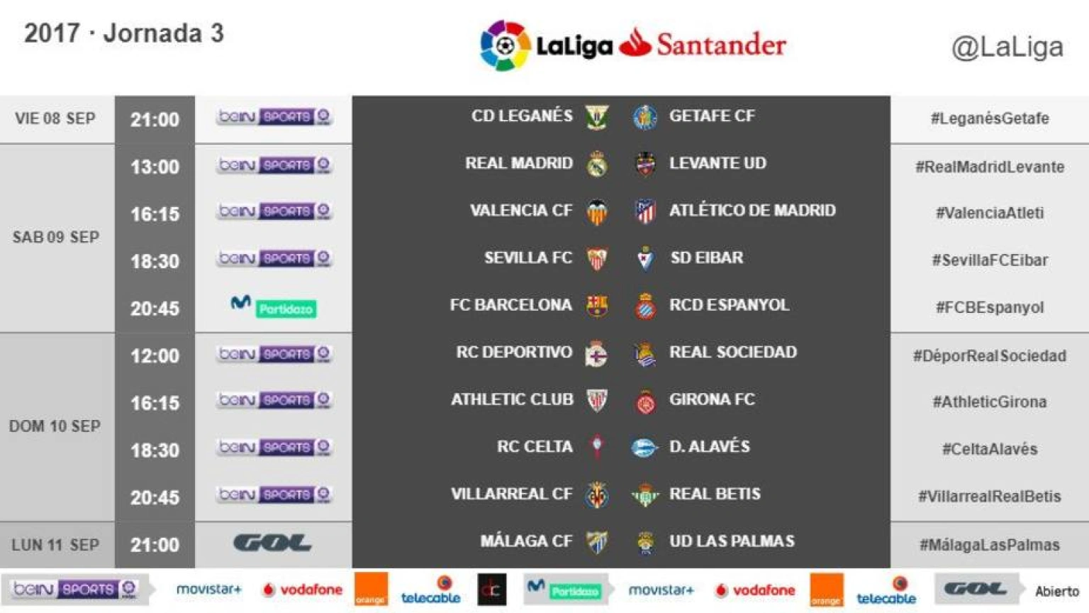 El Celta-Alavés de la tercera jornada se jugará el domingo 10 de septiembre a las 18.30. El Leganés-Getafe abrirá la jornada el viernes 8 a las 21.00.