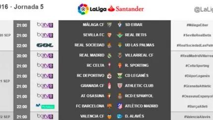 LaLiga ha dado a conocer los horarios de la 5ª jornada de LaLiga Santander 2016/17, que se disputará entre el martes 20 y el jueves 22 de septiembre de 2016.Esta jornada arrancará el martes con el partido entre R. Sociedad y UD Las Palmas a las 22:00. La jornada terminará el jueves, a las 21:00 horas, con el Valencia - Alavés. Entre los partidos más destacados de esta jornada intersemanal destacan el derbi sevillano y el enfrentamiento entre FC Barcelona y Atlético de Madrid.