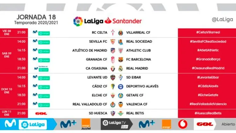 LaLiga ha dado a conocer este viernes los horarios de la jornada que se juega entre el 8 y el 11 de enero de 2021.
