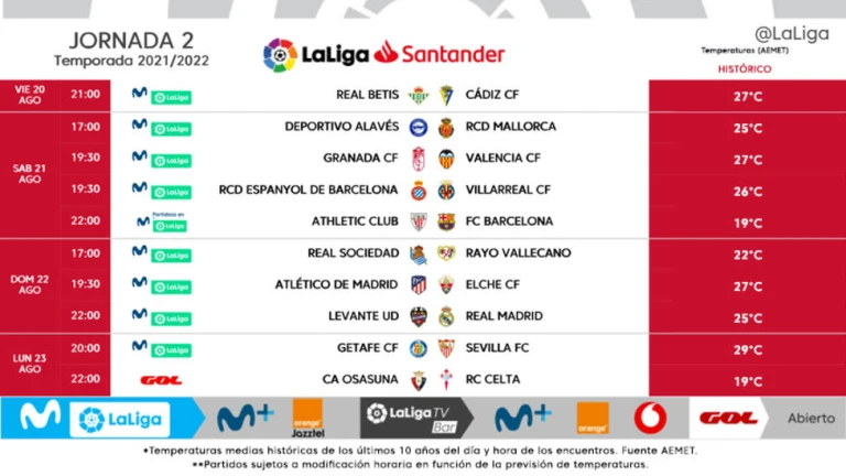 LaLiga ha dado a conocer los horarios de la segunda jornada de LaLiga Santander. Se disputará entre el viernes 20 y el lunes 23 de agosto, comenzando con el enfrentamiento entre Real Betis y Cádiz CF el viernes 20 de agosto a partir de las 21:00.