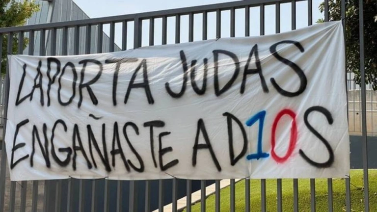 "Laporta Judas, engañaste a D10S" o "Laporta lacayo de Florentino" son algunos de los mensajes que han colocado en las afueras del estadio horas antes de que los azulgrana se enfrenten a la Real Sociedad en la primera jornada de Liga.