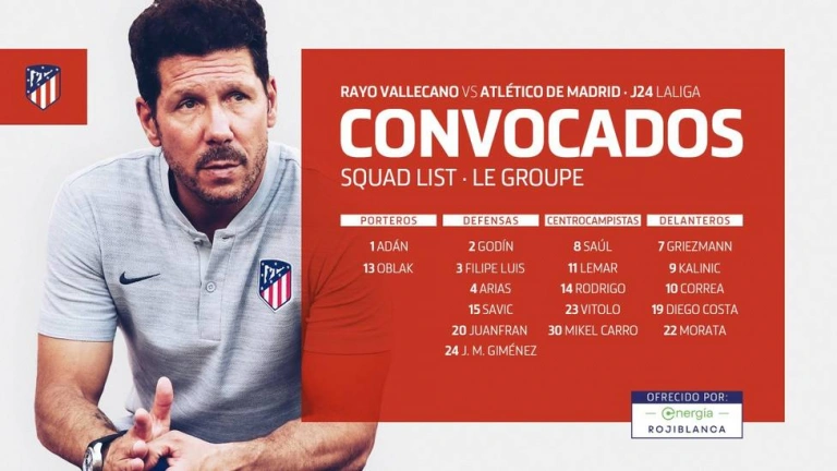 Entre esas tres ausencias, el técnico incluyó en la convocatoria de 18 para el choque de este sábado al centrocampista de la cantera Mikel Carro, de 20 años y que completa una lista compuesta por: Jan Oblak, Antonio Adán, Juanfran Torres, Santiago Arias, José María Giménez, Stefan Savic, Diego Godín, Filipe Luis, Saúl Ñíguez, Víctor Machín 'Vitolo', Rodrigo Hernández, Thomas Lemar, Ángel Correa, Antoine Griezmann, Nikola Kalinic, Álvaro Morata y Diego Costa.