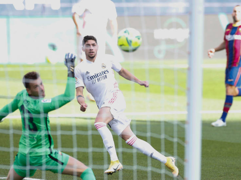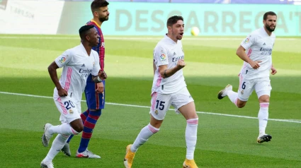 5'. ¡GOL! Marca el Real Madrid en su primera llegada, marca Fede Valverde. Pase espectacular de Benzema al espacio para carrera del uruguayo que se planta ante Neto y cruza con un disparo alto con la derecha para abrir el marcador. Empieza muy bien el Clásico.