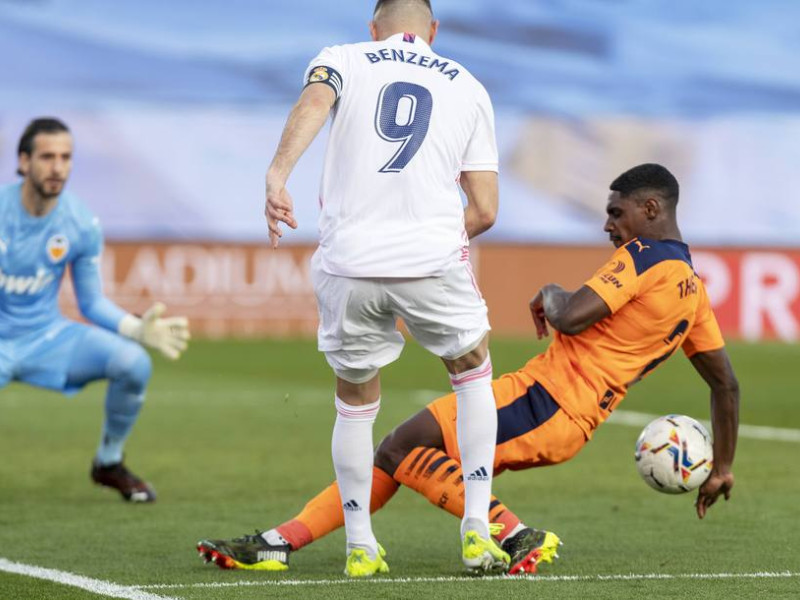 1. Tendido en el suelo Benzema, doliéndose muchísimo del tobillo izquierdo. Balón en largo de Varane, saltan Thierry Correia y el francés y el lateral derecho del Valencia le pisa al caer. Se reincorpora el hoy capitán del Real Madrid.