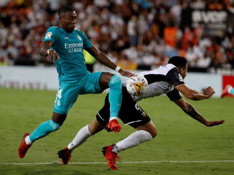 El Valencia pidió penalti por esta acción de Alaba sobre Maxi