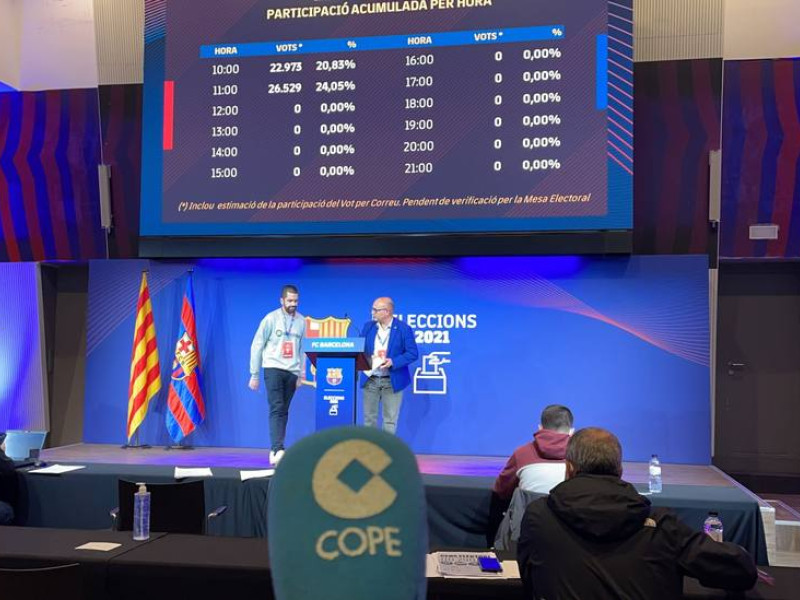 Un total de 23.619 socios y socias han votado ya de forma presencial en las elecciones a la presidencia del FC Barcelona, al llegar al ecuador de una jornada electoral que terminará a las 21.00 horas, con un 21,41 por ciento del censo electoral que ya ha ejercido su derecho a voto este domingo de forma presencial.