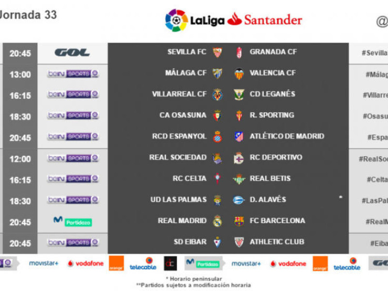 LaLiga ha dado a conocer el horario del 'Clásico' entre Real Madrid y Barcelona que se disputará el domingo 23 de abril a las 20:45 en el Santiago Bernabéu. Además, el Espanyol recibirá al Atlético un día antes a partir de las 20:45h.