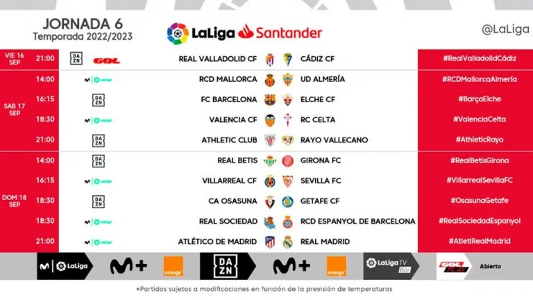 LaLiga ha dado ha conocer los horarios de la 6ª jornada de LaLiga Santander, que se celebra entre el viernes 16 y el domingo 18 de septiembre de 2022.