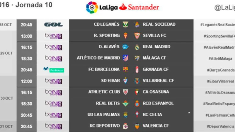 LaLiga ha dado a conocer los horarios de la 10ª jornada y destacan: Sábado 29 de octubre a las 16:15h, Alavés - Real Madrid; a las 18:30h, Atlético - Málaga y a las 20:45h, Barcelona - Granada.