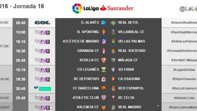 LaLiga ha dado a conocer los horarios de la 16ª jornada donde destacan: Sábado 17 de diciembre, a las 16:15h, Atlético - Las Palmas; Domingo 18 de diciembre 20:45h, Barcelona - Espanyol. El Valencia-Real Madrid queda aplazado por la disputa del Mundial de Clubes.