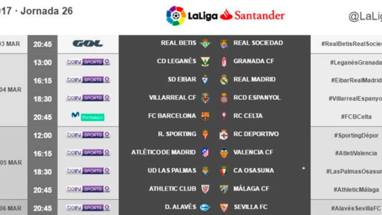 En esta jornada destacan los encuentros: Eibar-R.Madrid (sábado 4 de marzo, 16:15h); Barcelona-Celta (sábado 4 de marzo, 20:45h); Atlético-Valencia (domingo 5 de marzo, a las 16:15h); Alavés-Sevilla (lunes 6 de marzo a las 20:45h).