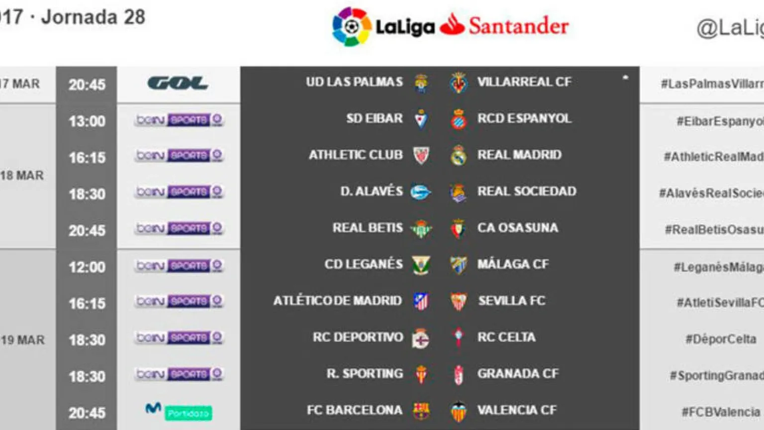 El encuentro entre el Athletic y el Real Madrid se disputará el sábado 18 de marzo a las 16.15 horas, mientras que el choque entre el Barcelona y el Valencia completará la vigésima octava jornada de LaLiga Santander que abre el viernes el Las Palmas-Villarreal. La sesión incluye el duelo entre el Atlético Madrid y el Sevilla, en el Vicente Calderón el domingo a las 16.15 y dos choques más con la permanencia en juego: Leganés-Málaga (domingo 12.00 horas) y el Sporting-Granada (domingo, 16.30 horas).